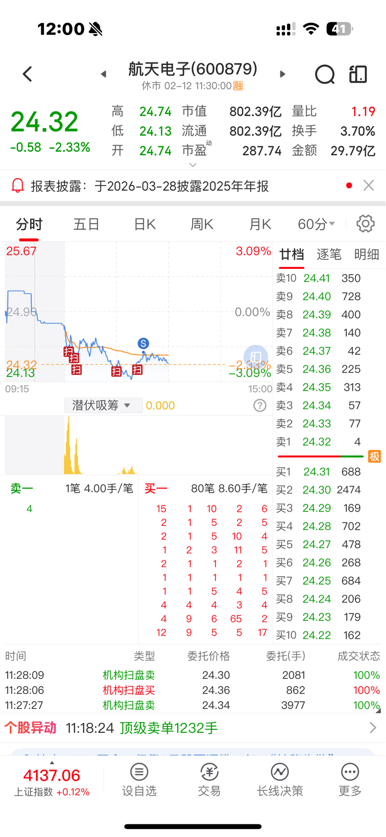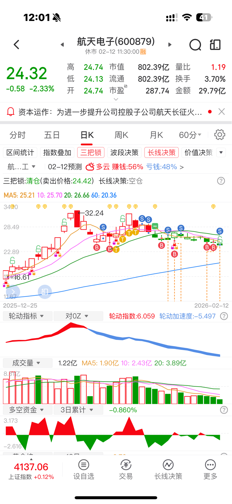 $航天电子(SH600879)$ 2波赚了几个,凑合吧,本来已经锁定盈利,前天看到24.87拿下,但昨天1:15还不错,然后利好不涨今天全部破位,这下100股都不留了,清了…暂时不会碰了,不敢赌春晚航空节目反响,大盘板块都行,电子居然这样…怕要摸21在起稳,这位置容易吐利润,所以拜拜了,等你恐慌释放结束的!未来等你