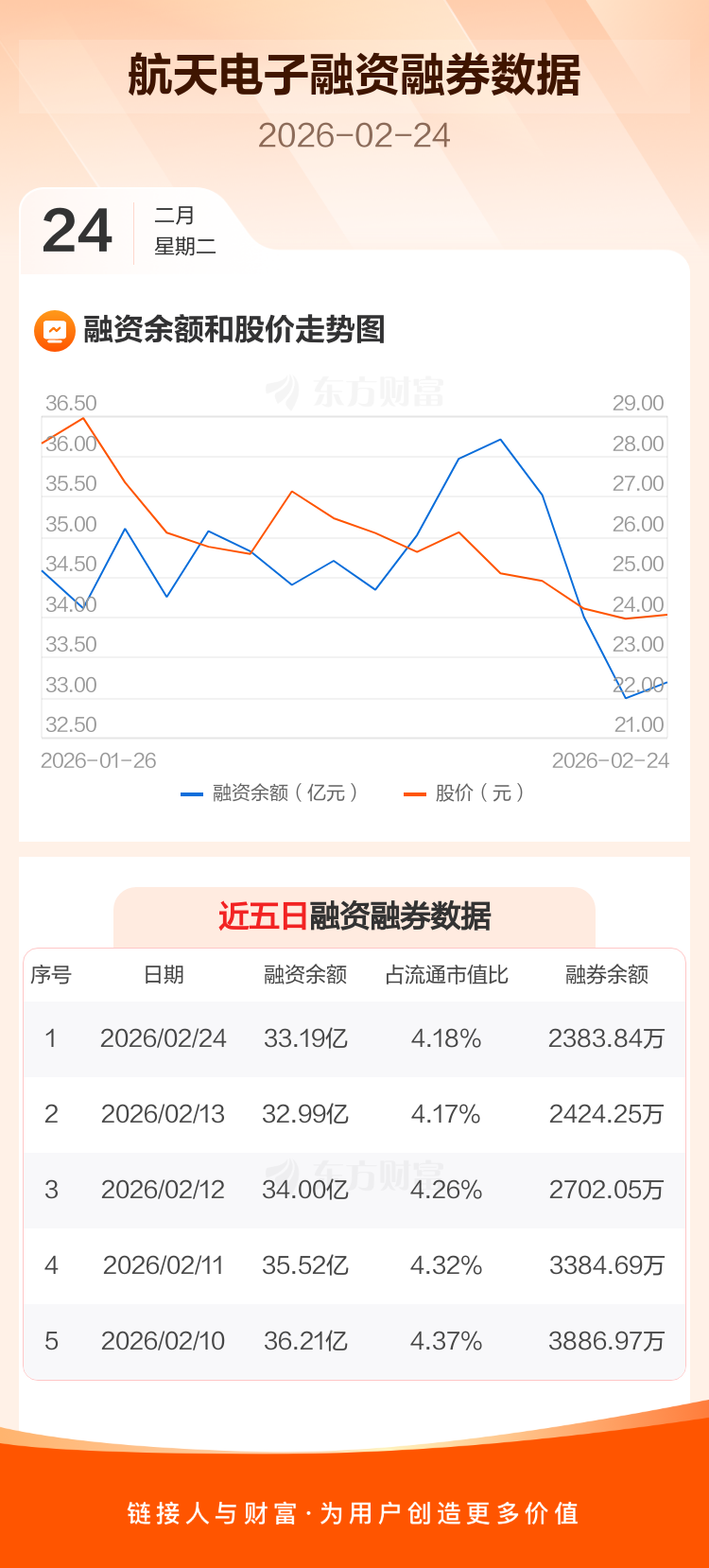 交易所最新数据显示,航天电子于2026年2月24日获融资买入2.55亿元,融资偿还2.35亿元,当日融资净买入1945.34万元。目前,该股融资余额33.19亿,占流通市值比例为4.18%。