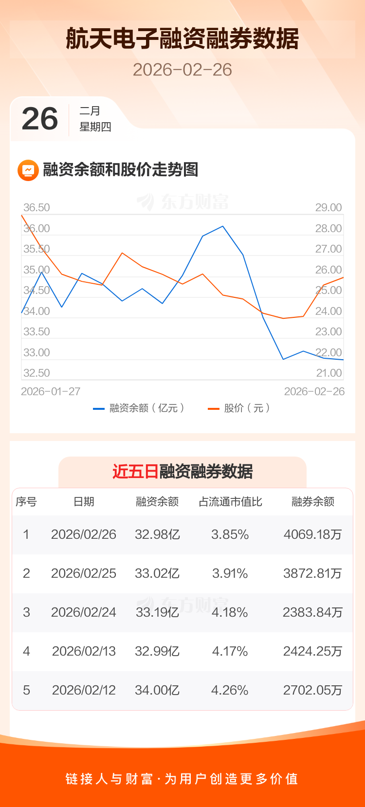 交易所最新数据显示,航天电子于2026年2月26日获融资买入5.41亿元,融资偿还5.44亿元,当日融资净偿还344.7万元。目前,该股融资余额32.98亿,占流通市值比例为3.85%。
