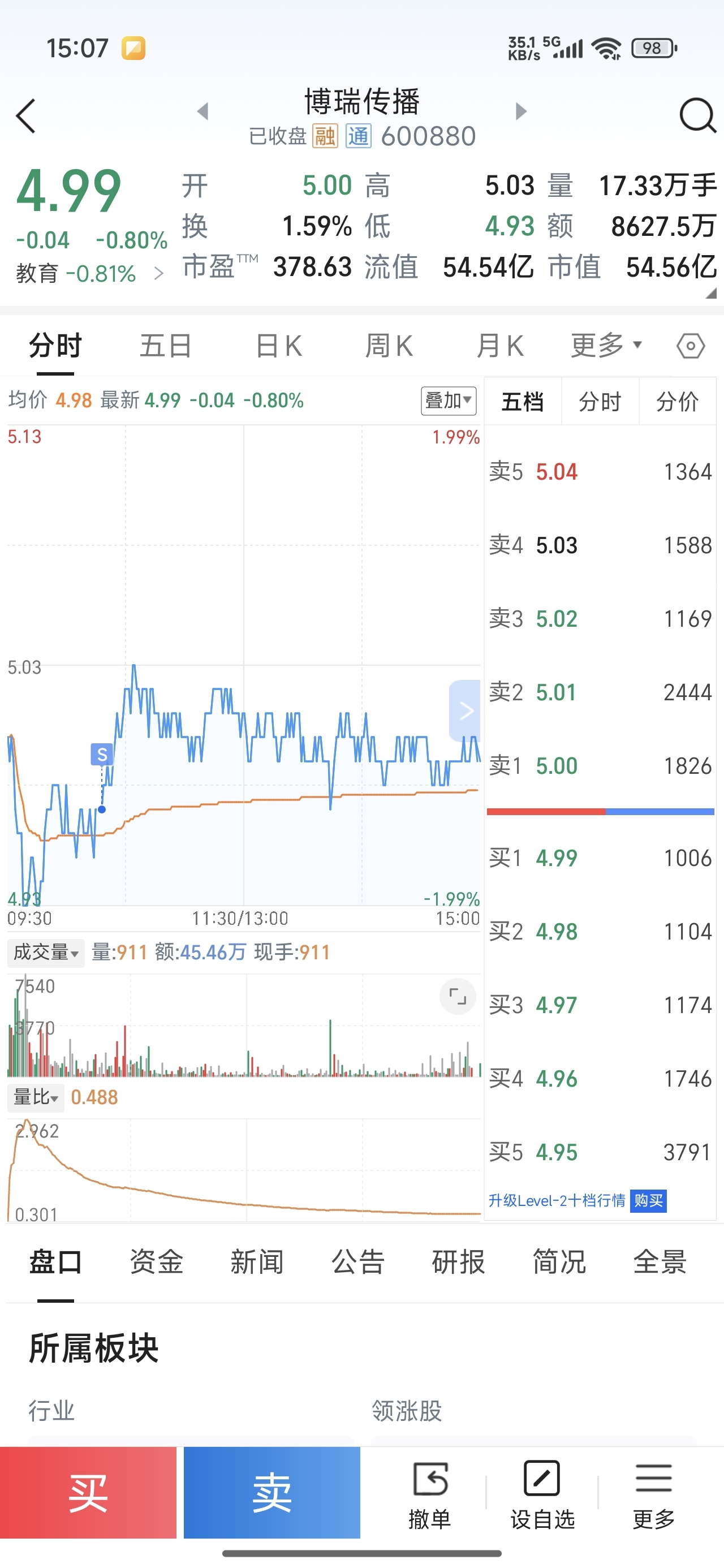 $博瑞传播(SH600880)$ 我已经割肉离场了,明天主力可以拉了,我输了,我熬不过你...