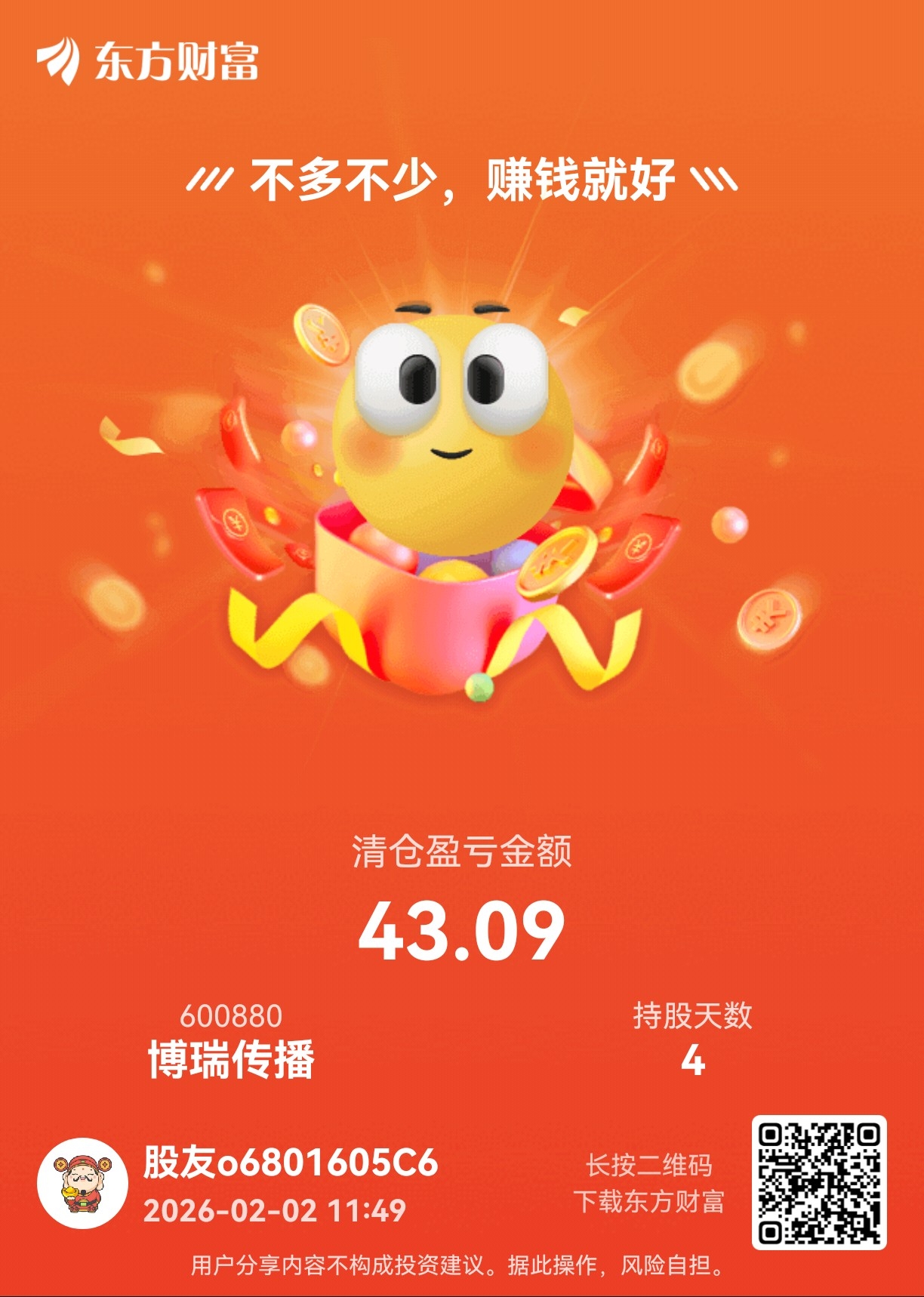 $博瑞传播(SH600880)$ 持股四天,挣了一个盒饭钱!