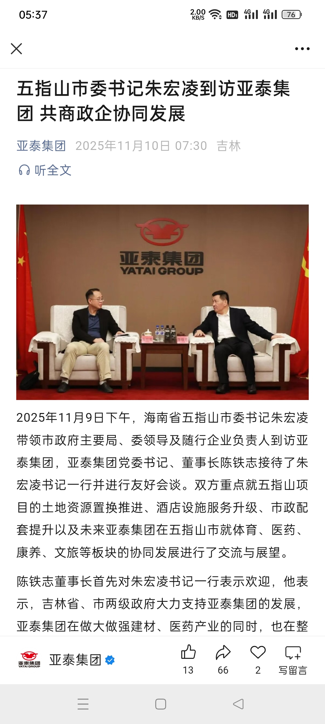 $亚泰集团(SH600881)$ 海南省五指山市委书记朱宏凌到访亚泰集团,共商政企协同发展。