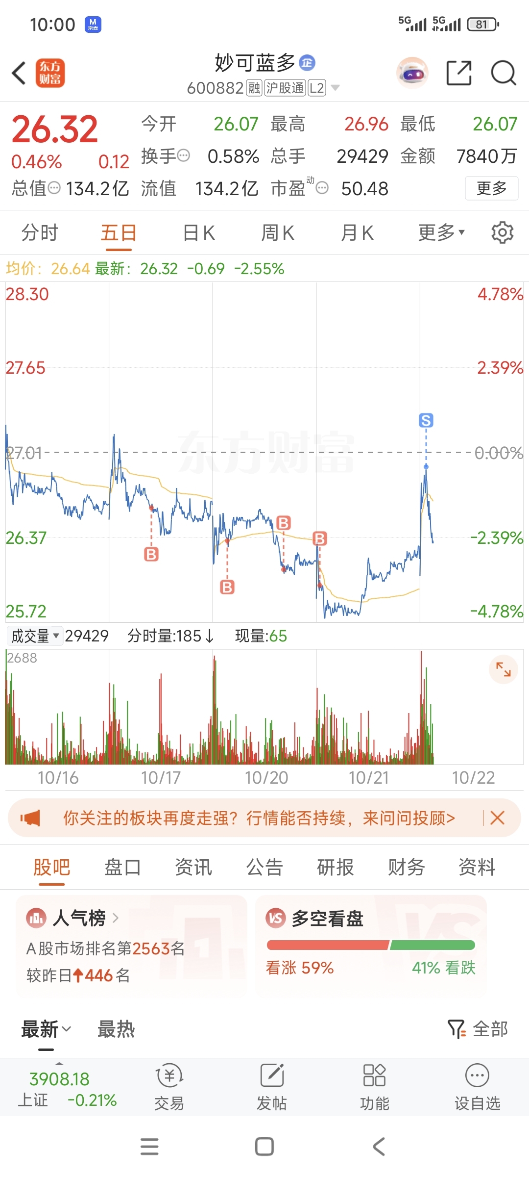 $妙可蓝多(SH600882)$ 还好今天高点清仓了。