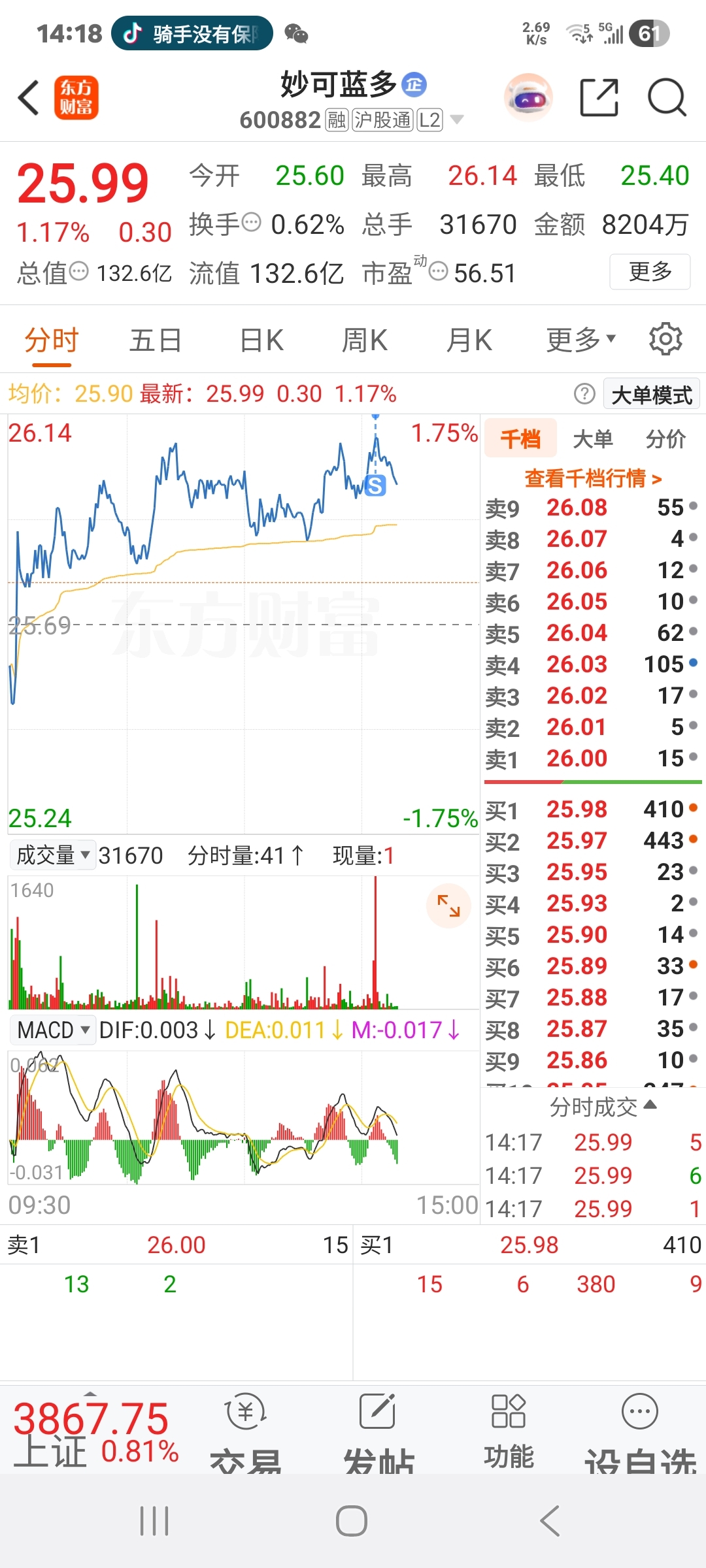 $妙可蓝多(SH600882)$ 冲高必须卖