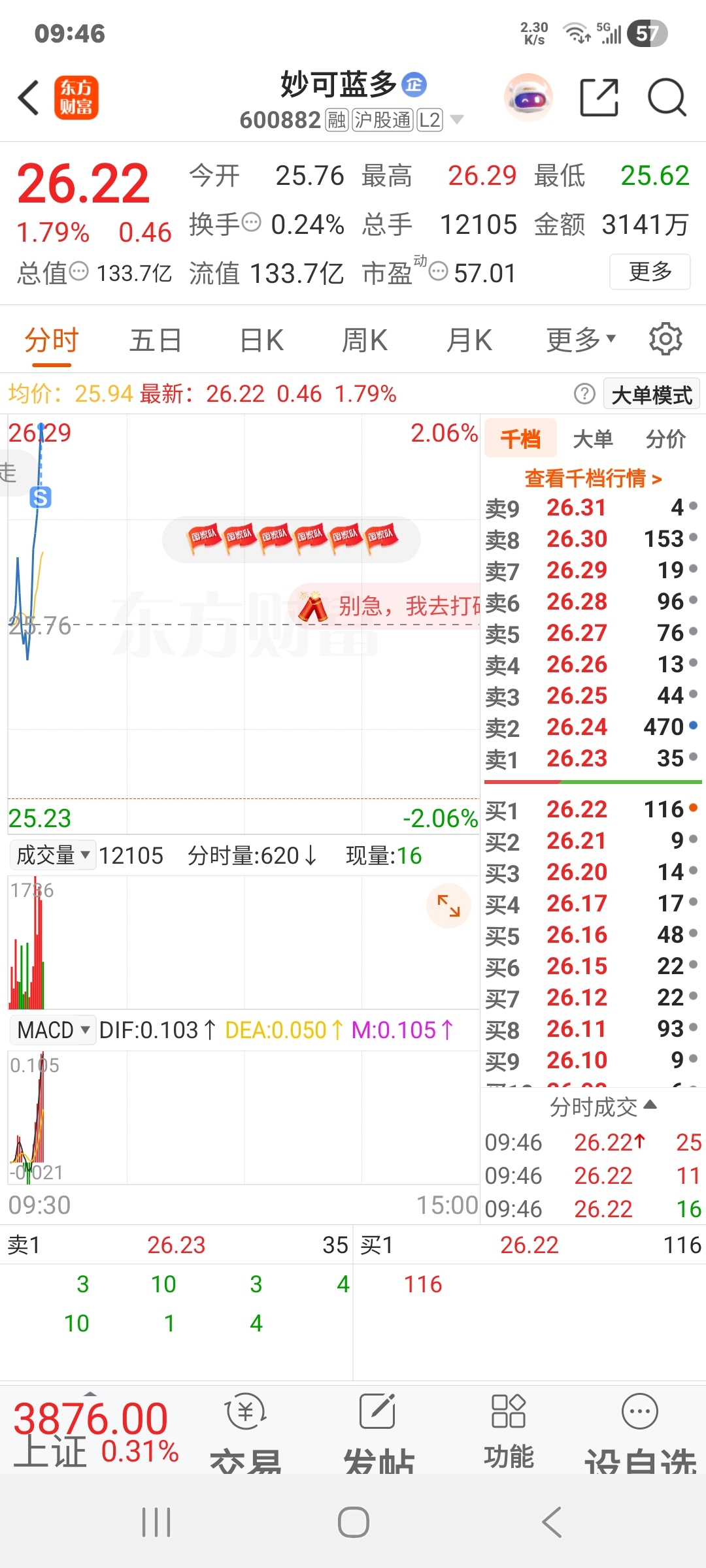 $妙可蓝多(SH600882)$ 冲高先出