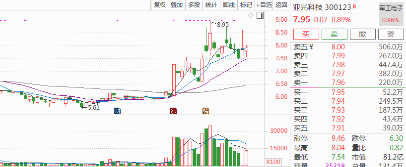 亚光科技,也还是军工叠加商业航天概念,公司做的军工电子及船舶业务,占据国内军用微波电路及组件的重要市场份额,具有特种船舶制造条件。这票最大的看点是前面的四根长头影线,跌又跌不下去,不是洗碟子是什么,有冲高注意再回落就行,20日均线有支撑。