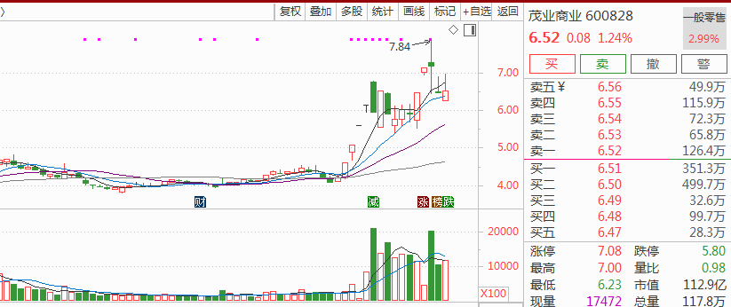 茂业商业,零售方向+免税概念,两个都是热点,上面提振消费的文件刚下来,茅台就启动调价方案,都催生了零售板块走持续性行情,这段时间也是反反复复出现异动行情,海南18日封关,离这个窗口也越来越近了,估算这个板块近两天还会有一次行情,虽然不是海南板块,可是海南自贸一涨,免税店概念也跟着动,茂业商业就有了反弹的理由。