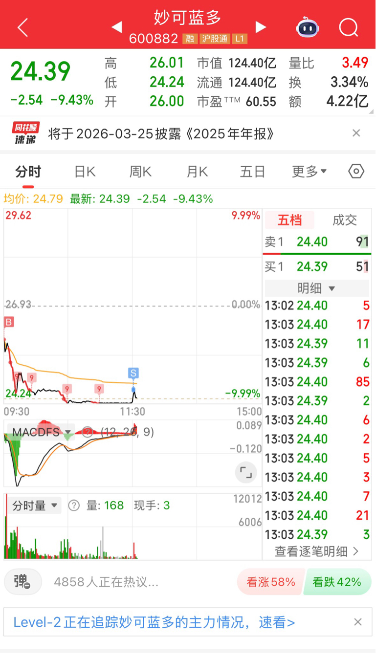 $妙可蓝多(SH600882)$ 做个t,等会跌下去再买进