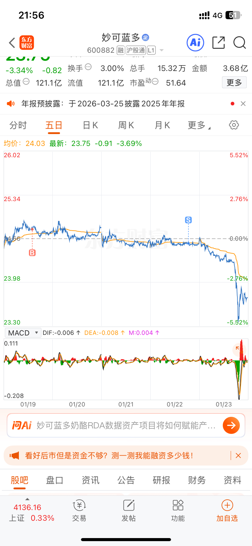 $妙可蓝多(SH600882)$ 亏了一点,割了。周五突然的下杀,绝对有利空。
