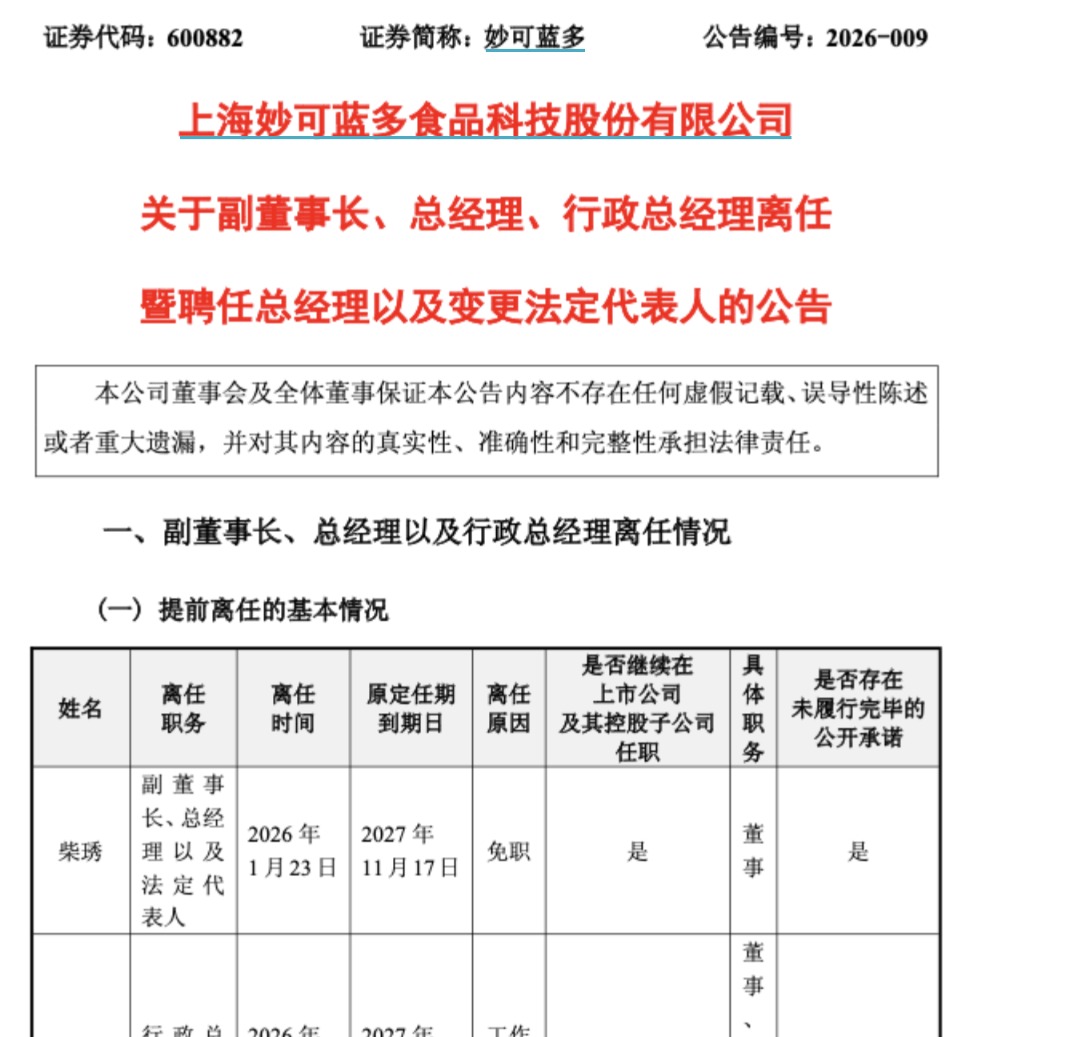 1月25日,妙可蓝多(600882)董事会一纸决议,免去了创始人柴琇的副董事长、总经理及法定代表人职务,仅保留其董事席位。这位被誉为“奶酪女王”、一手将公司推上“A股奶酪第一股”宝座的企业家,以近乎“净身出户”的方式告别了管理一线。接替她的是拥有深厚蒙牛背景的蒯玉龙。