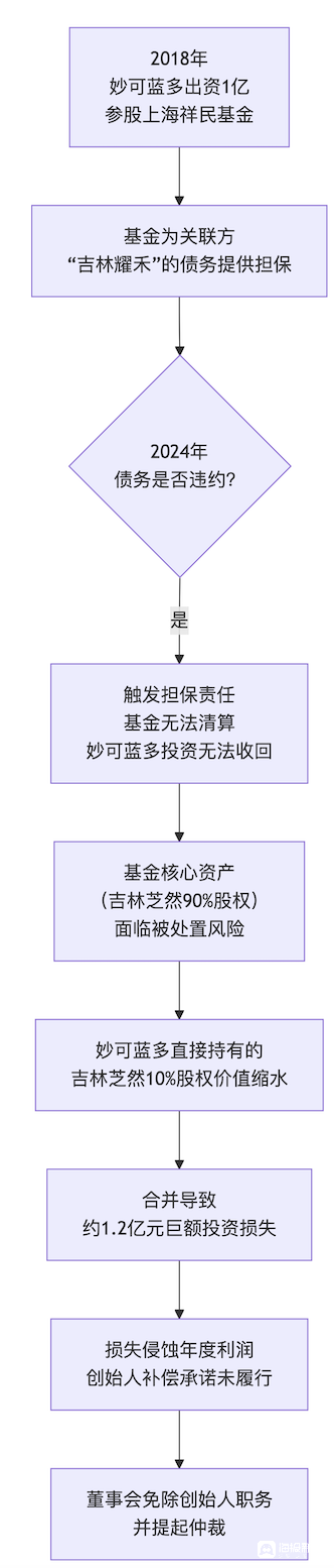 问题在2024年爆发,由于吉林耀禾未能偿还其对控股股东蒙牛的债务,导致提供担保的并购基金被拖累,无法清算。这意味着,妙可蓝多当年投入的1亿元本金及收益面临无法收回的风险。更复杂的是,由于该基金的核心资产(持有“吉林芝然”公司90%股权)可能被用于抵债,妙可蓝多自身直接持有的吉林芝然10%股权价值也同步缩水。