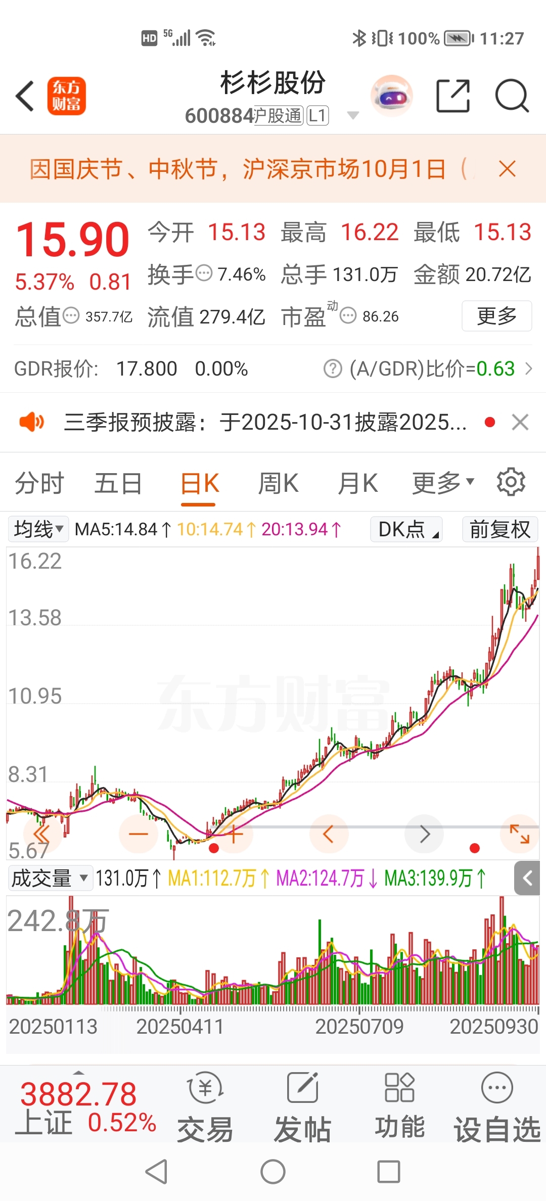 $杉杉股份(SH600884)$ 这个天天上涨。没有涨停板。是不是偷偷的吃筹码