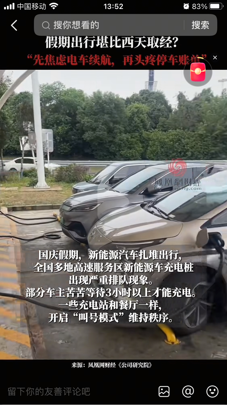 国庆出行,新能源车充电排长队,严重短缺!利好杉杉!!!