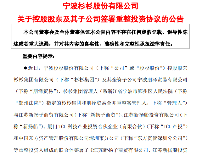 根据公告,公司控股股东杉杉集团有限公司(下称“杉杉集团”)及其全资子公司宁波朋泽贸易有限公司(下称“朋泽贸易”)与杉杉集团管理人、重整投资人联合体签署了《重整投资协议》。