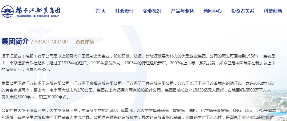 扬子江官网介绍,公司目前总资产超630亿元,占地面积超500万平方米,码头岸线5000余米,职工3万余名。公司拥有大型干船坞三座,大中型船台三座,年造船生产能力600万载重吨,
