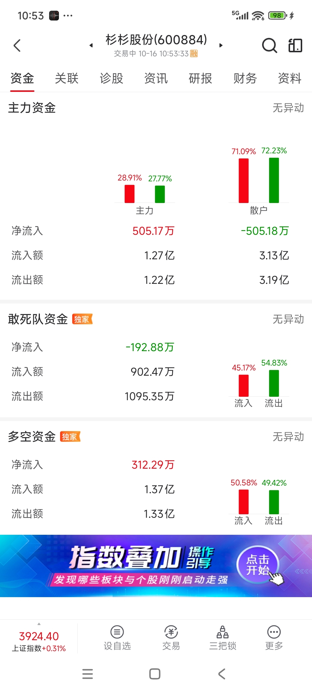 $杉杉股份(SH600884)$ 开盘准备卖出一部分,结果又贪心了,这只票主力一直出货,并且还来点高抛低吸,短期没戏,游资没底也一直卖出。