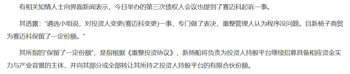 2、赛迈克的起诉就是为了要点股权,《重整投资协议》留有口子,之前新扬子商贸真有可能把赛迈克甩了,这样一闹,一定会给它留份额。