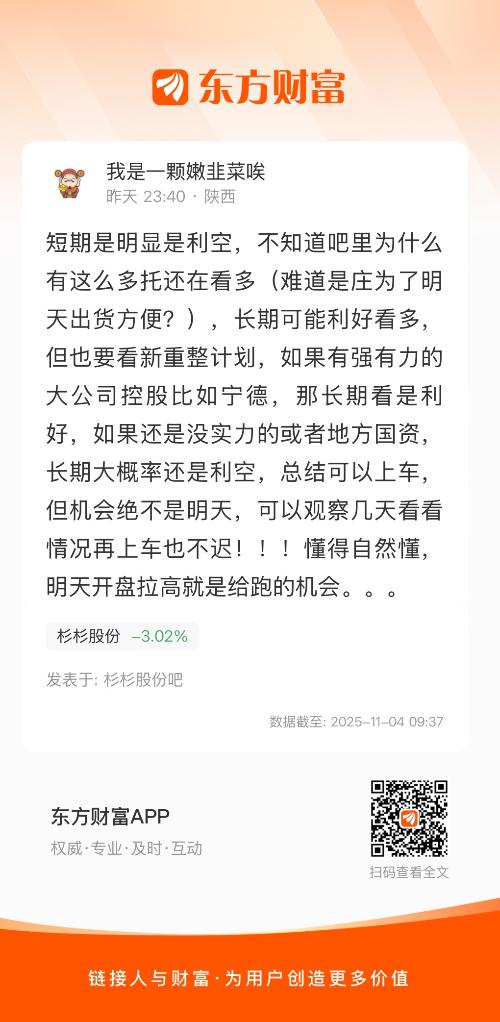 短期是明显是利空,不知道吧里为什么有这么多托还在看多(难道是庄为了明天出货方便?),长期可能利好看多,但也要看新重整计划,如果有强有力的大公司控股比如宁德,那长期看是利好,如果还是没实力的或者地方国资,长期大概率还是利空,总结可以上车,但机会绝不是明天,可以观察几天看看情况再上车也不迟!!!懂得自然懂,明天开盘拉高就是给跑的机会。。。