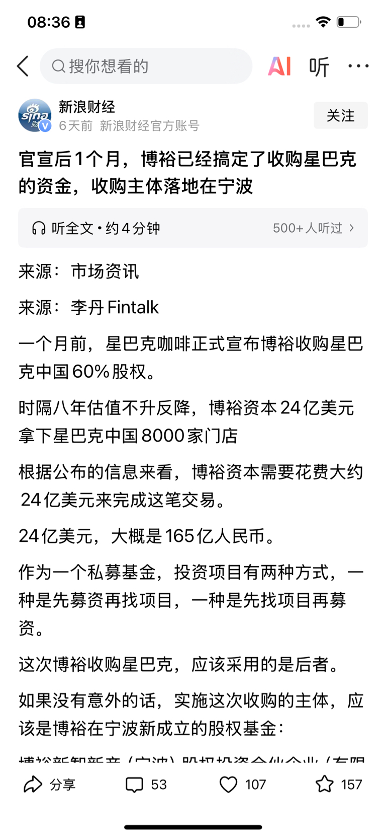 新浪财经已经报出来了,博裕这个成立的基金就是收购星巴克的。大佬们觉得真的假的?