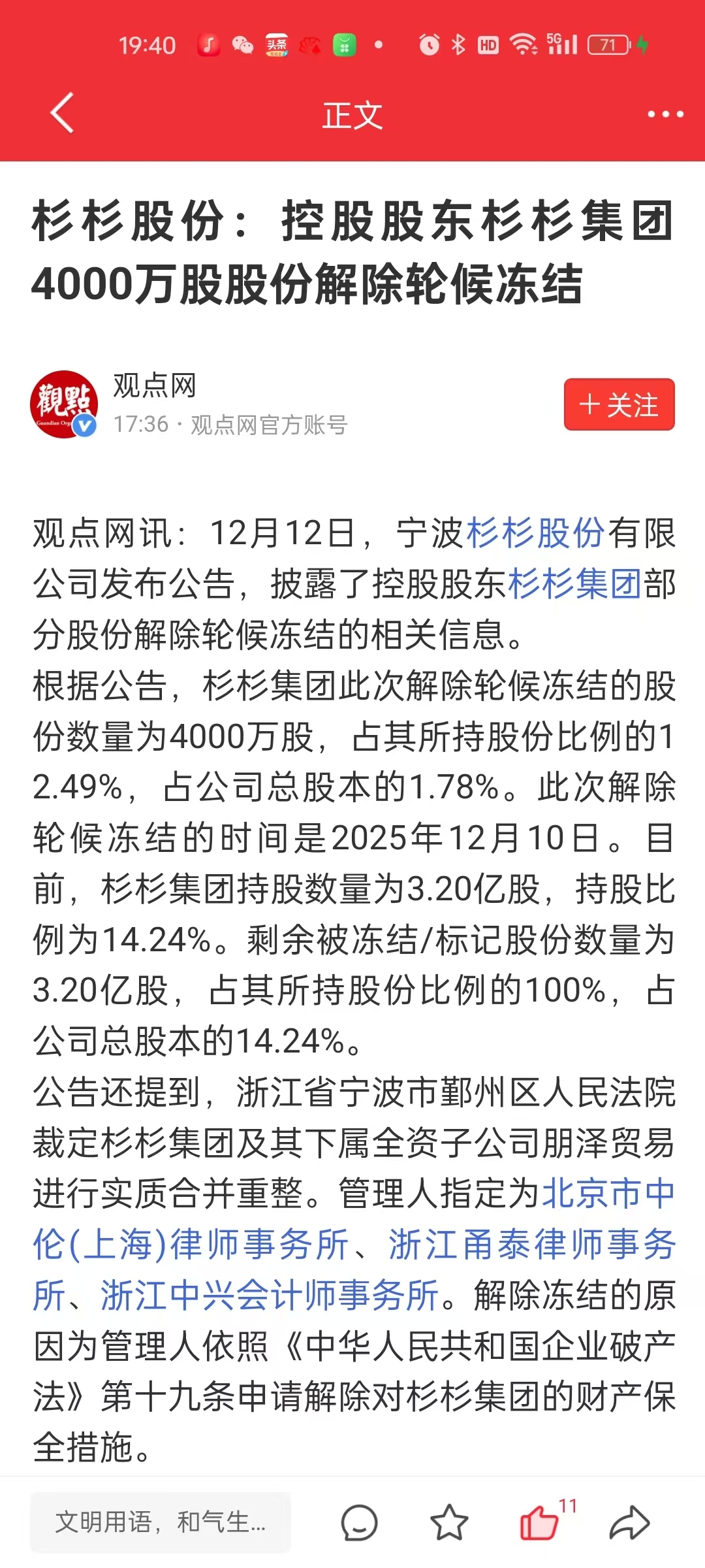 $杉杉股份(SH600884)$ 大利好,今日解处轮候冻结股份了,重整已定了