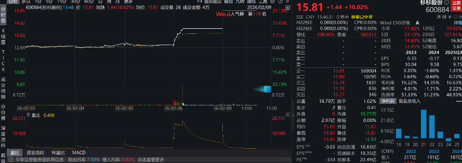 2月8日晚,杉杉股份(600884.SH)公告签署重整投资协议。受该消息影响,杉杉股份连续两个交易日涨停,2月9收盘报收15.81元,最新市值356亿元。