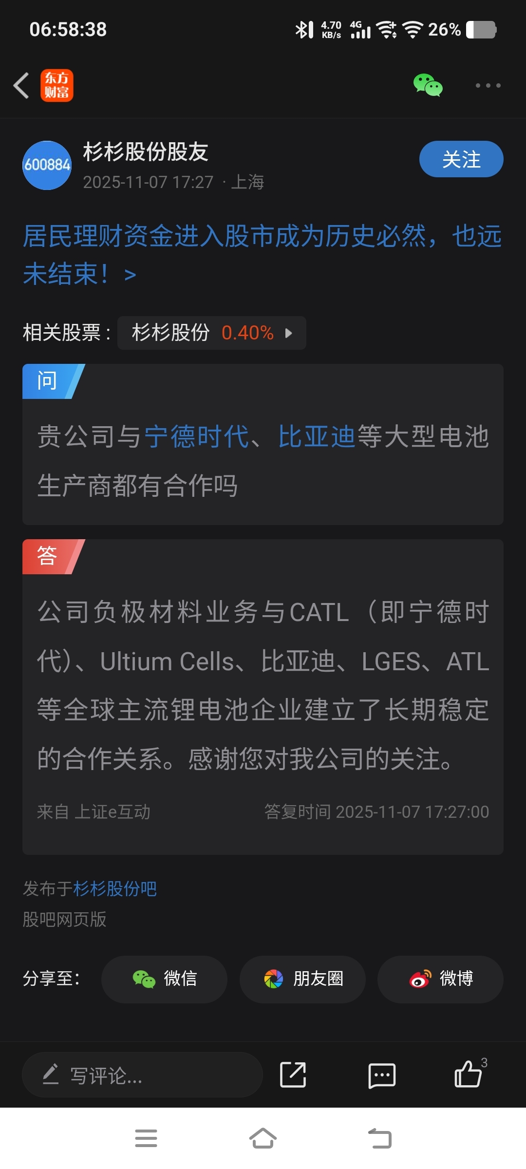 $杉杉股份(SH600884)$ 杉杉股份有长期投资价值,只用官方信息。- 董秘回复(2025年11月):在投资者互动平台上,公司明确表示负极材料客户包括宁德时代、UltiumCells、比亚迪、LGES、ATL等全球主流锂电池企业