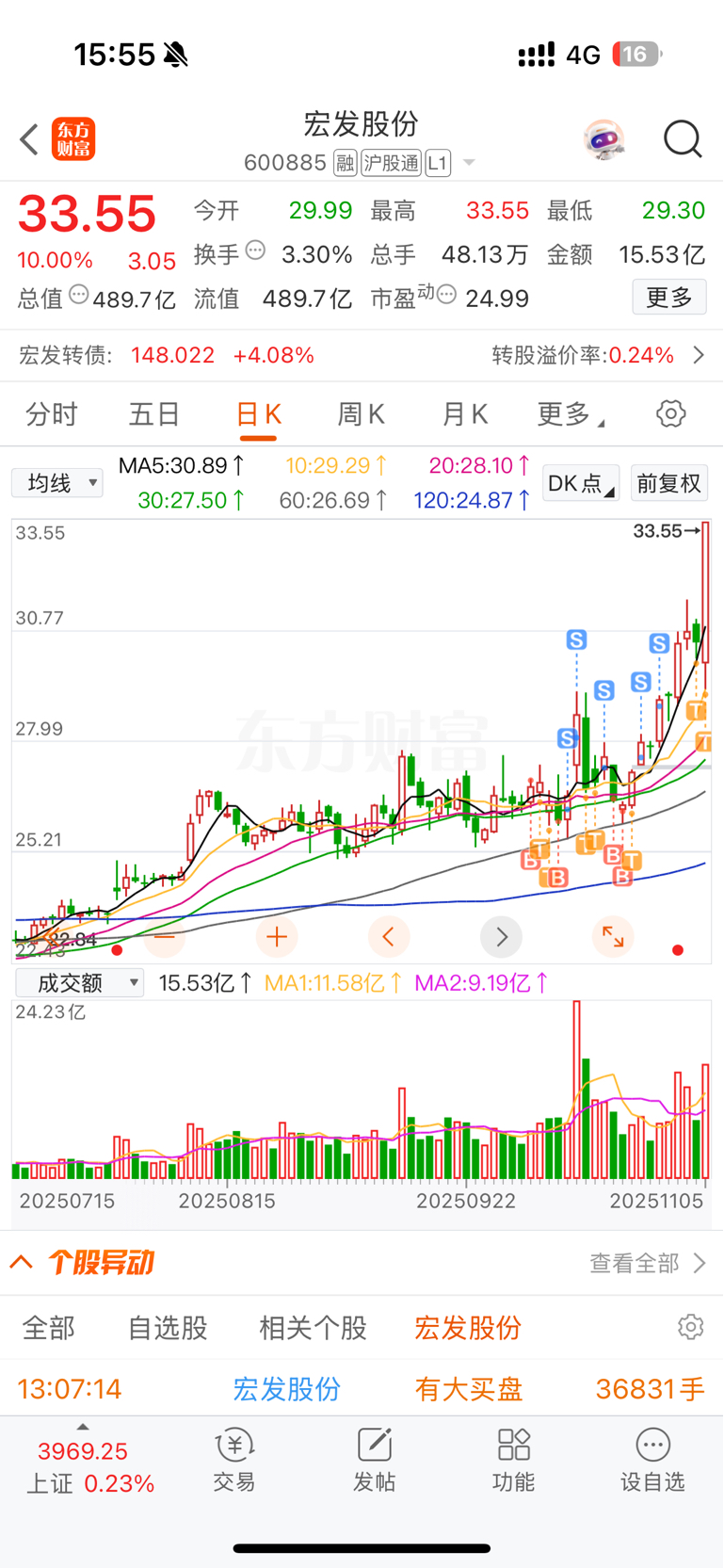 $宏发股份(SH600885)$ 明天如果水下可以做T,水上不动,目前主升浪阶段,回调就可以T,没能力的建议持股不动