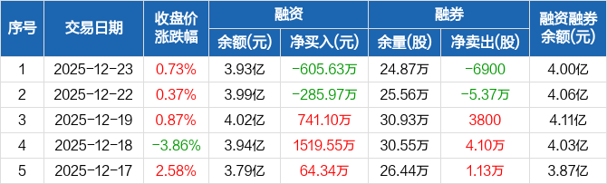 宏发股份:融资净偿还605.63万元,融资余额3.93亿元(12-23)