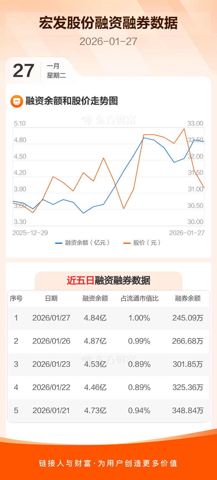 交易所最新数据显示,宏发股份于2026年1月27日获融资买入5107.91万元,融资偿还5379.77万元,当日融资净偿还271.86万元。目前,该股融资余额4.84亿,占流通市值比例为1.00%。