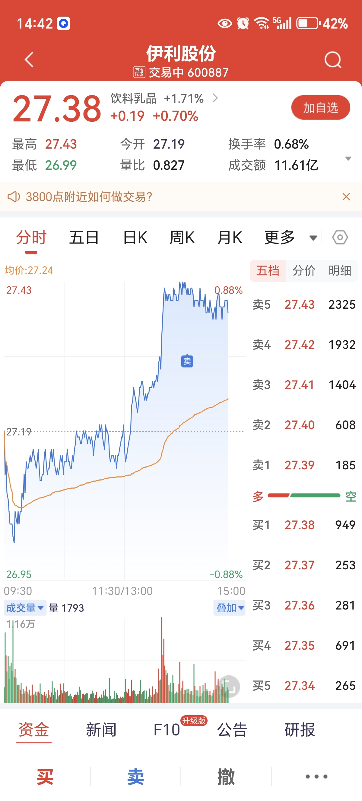 $伊利股份(SH600887)$ 太磨蹭了,一潭死水,27.42全还给你了…节后择机再来,留下的发财…