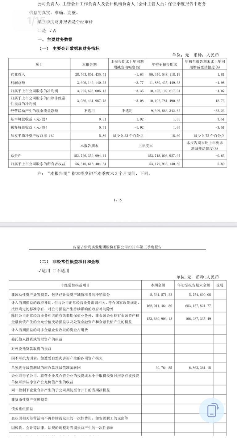 $伊利股份(SH600887)$ 2025年3季度:营收903亿元,同比+1.81%; 归母净利润104亿元,同比-4.07%(营收较中报减速)