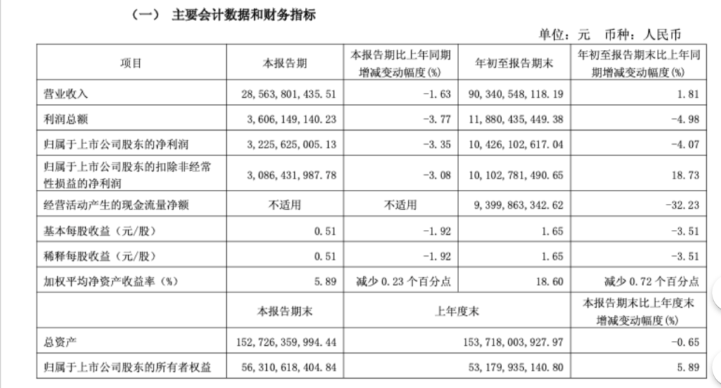 第三季度,伊利股份营业收入285.64亿元,同比下降1.63%;归属于上市公司股东的净利润32.26亿元,同比下降3.35%。