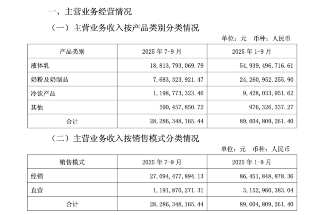 伊利股份发布的第三季度经营数据的公告显示,该公司三季度的主营业务收入282.86亿元,其中液体乳贡献188.14亿元,占总额66.5%;奶粉及奶制品收入76.83亿元,占比27.1%;冷饮产品收入11.99亿元,占比4.2%;其他产品收入5.90亿元,占比2.09%。1至9月,该公司主营业务收入896.05亿元,液体乳收入549.39亿元,占比61.3%,为收入核心支柱;奶粉及奶制品收入为242.60亿元,占比27%。