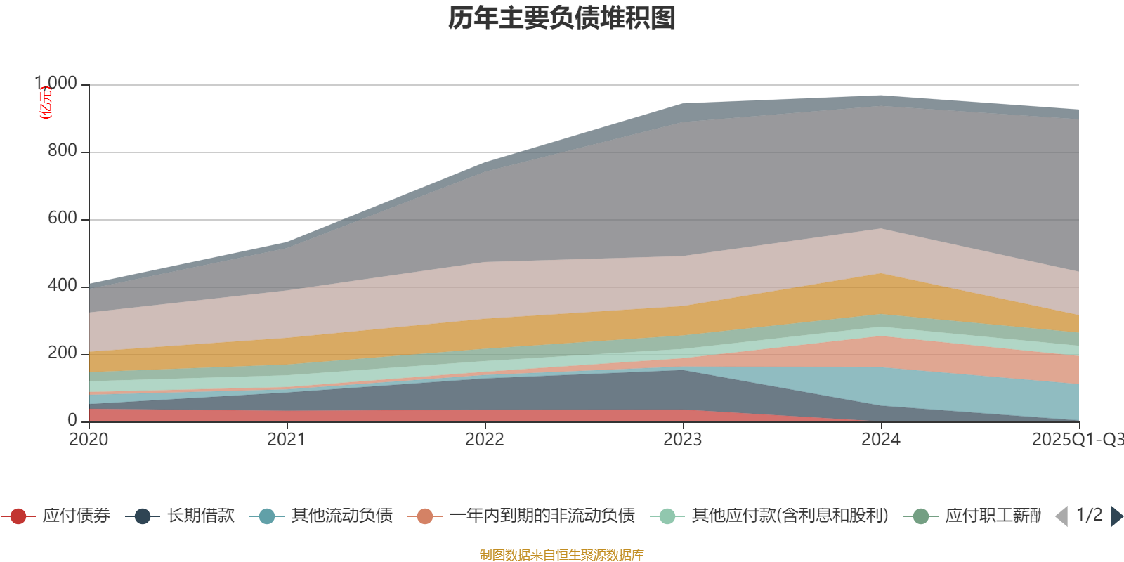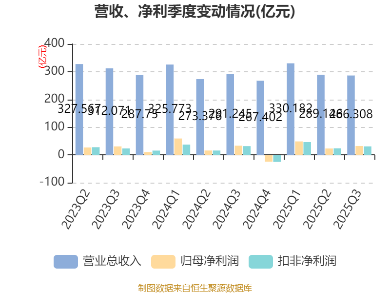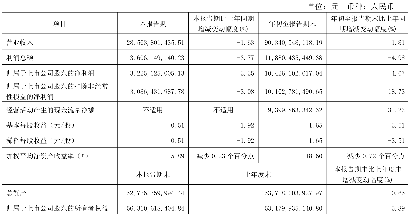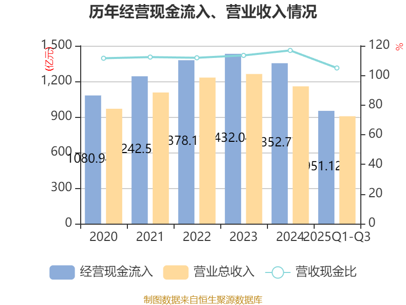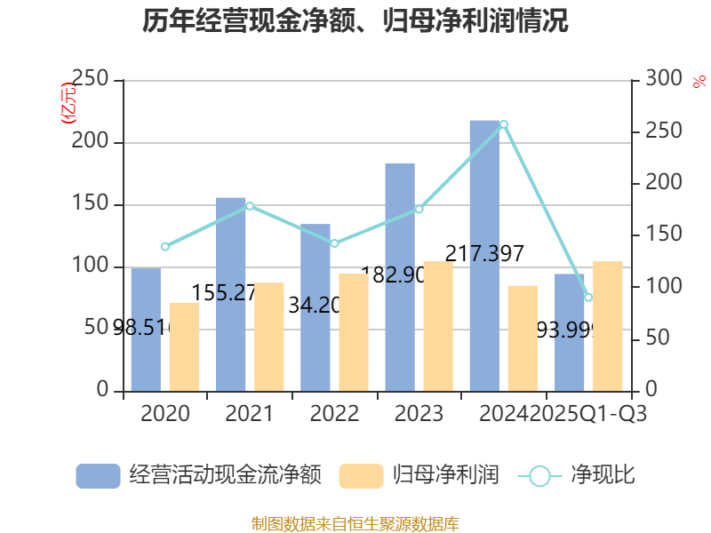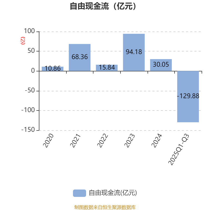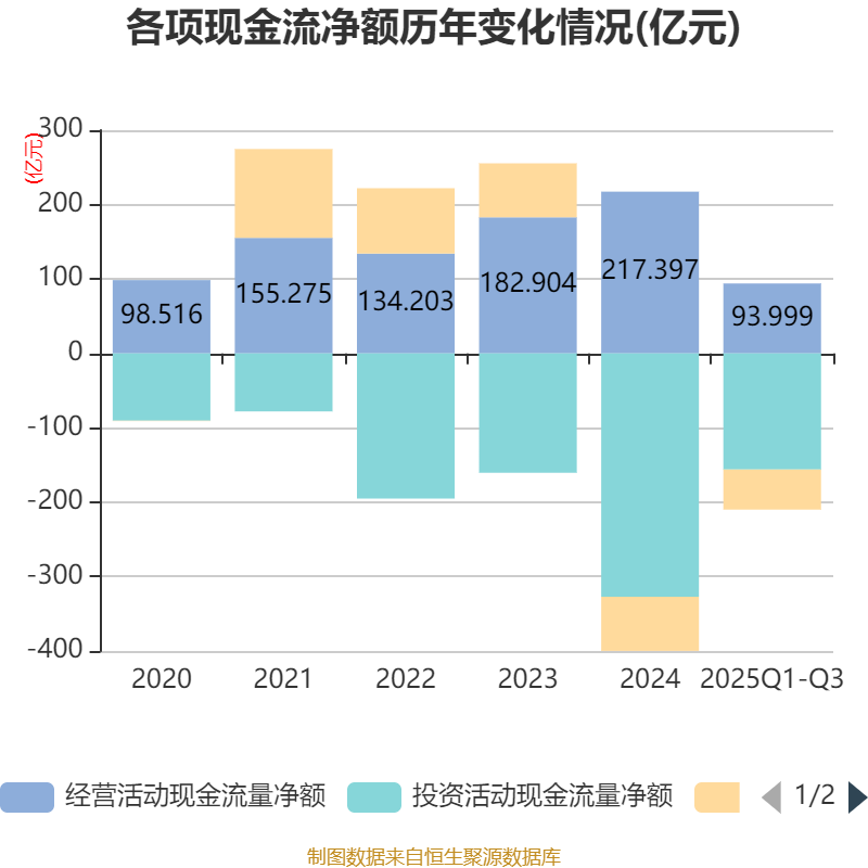 2025年前三季度,公司经营活动现金流净额为94亿元,同比下降32.23%;筹资活动现金流净额-53.9亿元,同比减少4472.92万元;投资活动现金流净额-156.1亿元,上年同期为-50.76亿元。