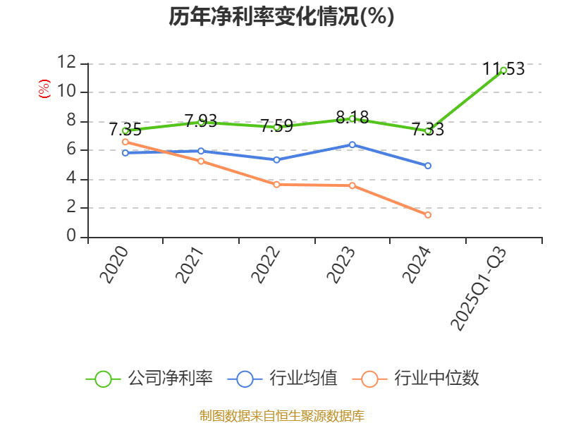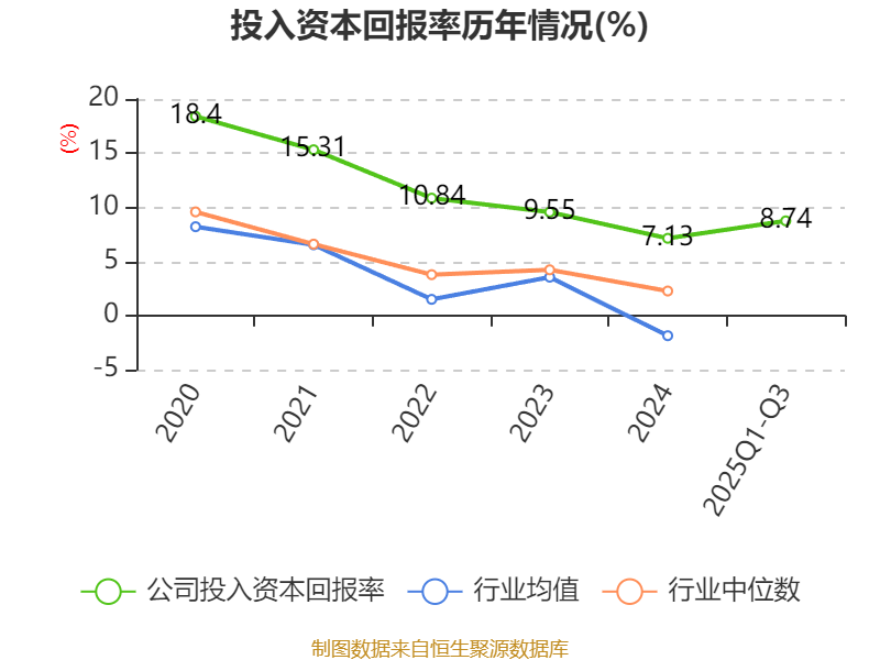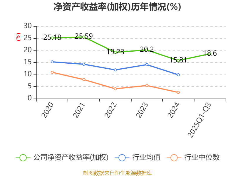 盈利能力方面, 2025年前三季度公司加权平均净资产收益率为18.6%,同比下降0.72个百分点。公司2025年前三季度投入资本回报率为8.74%,较上年同期持平。