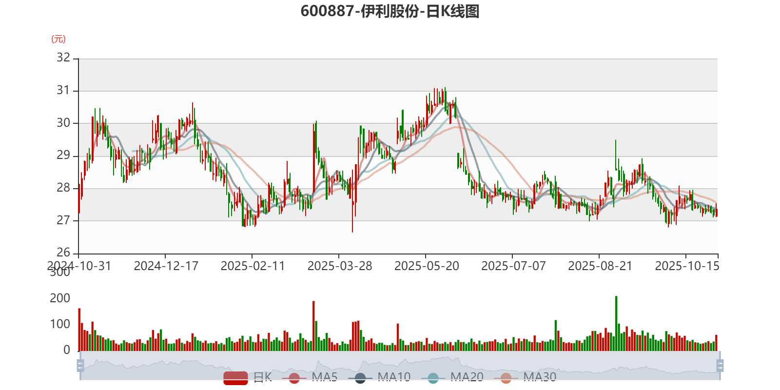 以10月30日收盘价计算,伊利股份目前市盈率(TTM)约为21.6倍,市净率(LF)约3.07倍,市销率(TTM)约1.48倍。
