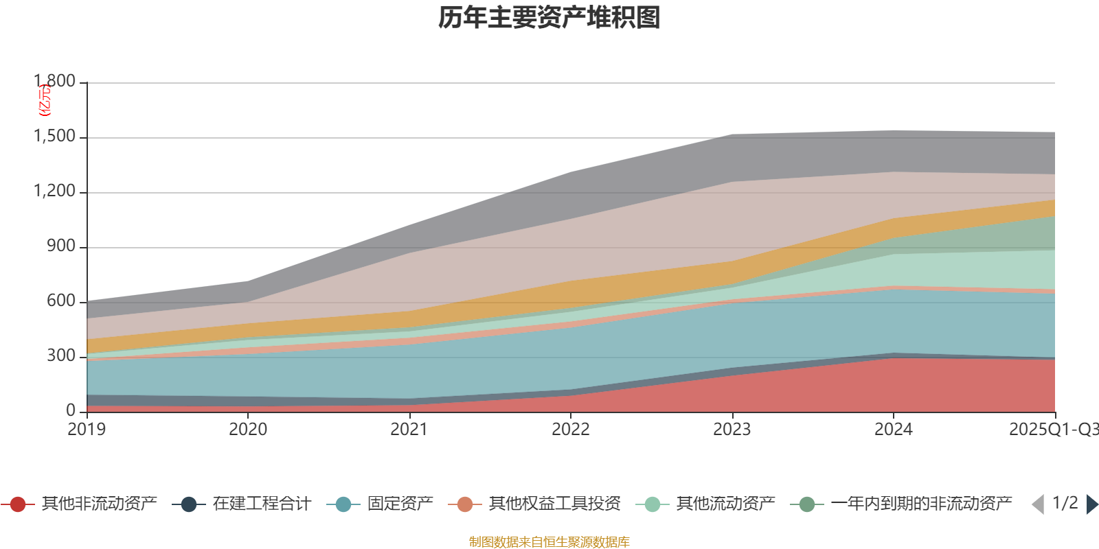 资产重大变化方面,截至2025年三季度末,公司货币资金较上年末减少45.57%,占公司总资产比重下降7.47个百分点;一年内到期的非流动资产较上年末增加109.58%,占公司总资产比重上升6.43个百分点;其他流动资产较上年末增加24.53%,占公司总资产比重上升2.82个百分点;在建工程合计较上年末减少57.26%,占公司总资产比重下降1.1个百分点。