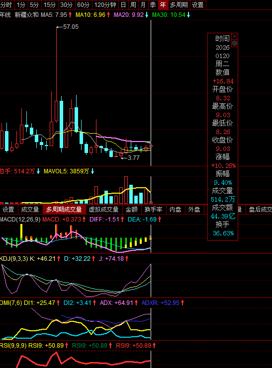 最关键的一点是,新疆众和三年四个月以来,自2026年的元旦第一天咱就前瞻性的发表了《今天是2026年马年的第一天,祝福咱的同路人们马到成功!》贴子,提示大家重点关注新疆众和。从年线上无论是从技术面,基本面还是消息面都积蓄了极大的做多能量,我们首先来看看其从技术面给广大的投资者传递了一个置信无疑的一个强大画面。(这是在除权状态下新疆众和的年线示意)最为明显的是股价处在历史的低位,自2020年底就放出了大量,21年的高点后一直处在横盘的状态下,并且是自2015年以来就积攒大量的历史性沉淀的筹码,(咱在本贴中已经对筹码的分布及现状已经做过描述在此不重复)此截图的用意在于新疆众和能在此点位轻松拉起,上升的空间将无可限量!周二的收盘点位是自2013年以来的最高点位,也就是说2026年一月20日的收盘价将13年(加26年是14年的年线)的收盘价一概踩在脚下...
