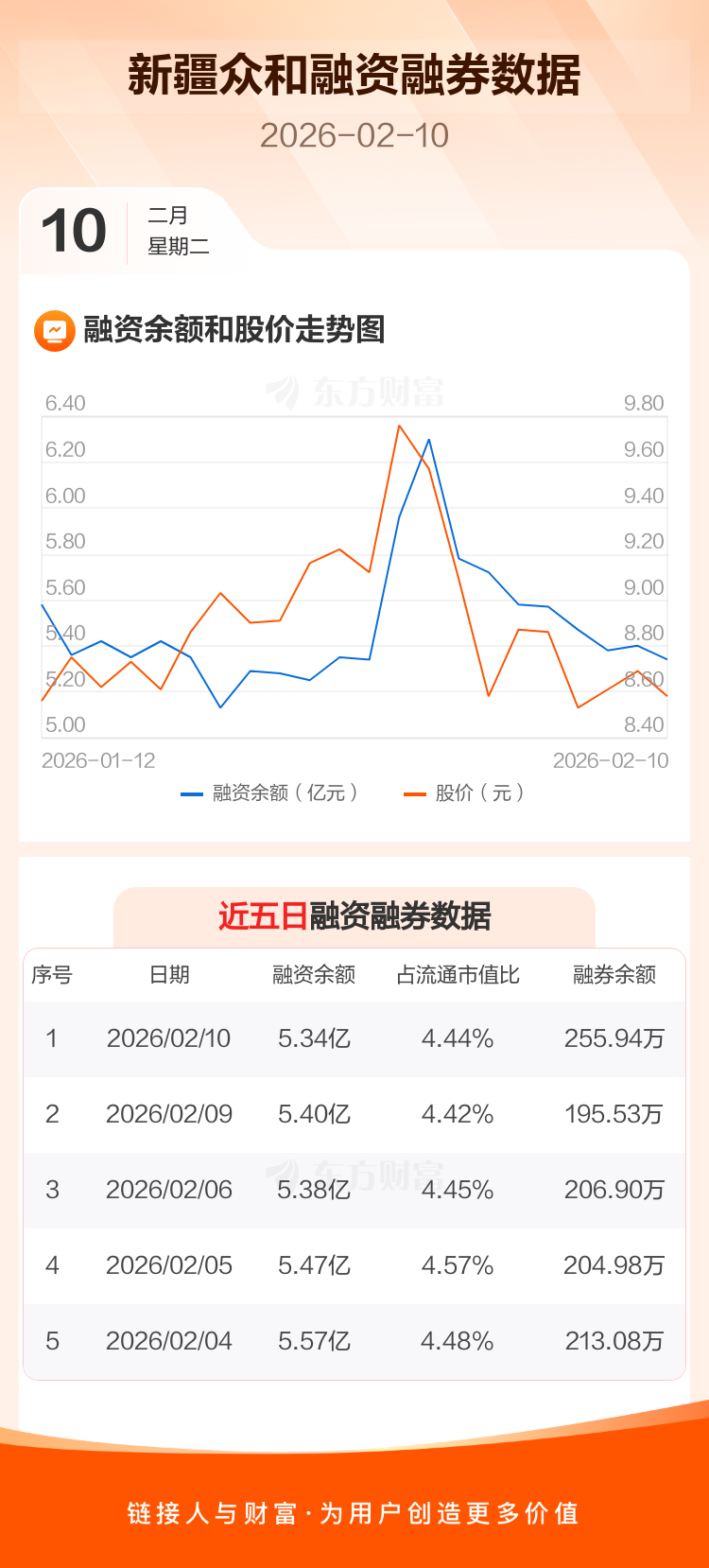 交易所最新数据显示,新疆众和于2026年2月10日获融资买入2359.32万元,融资偿还2881.93万元,当日融资净偿还522.61万元。目前,该股融资余额5.34亿,占流通市值比例为4.44%。