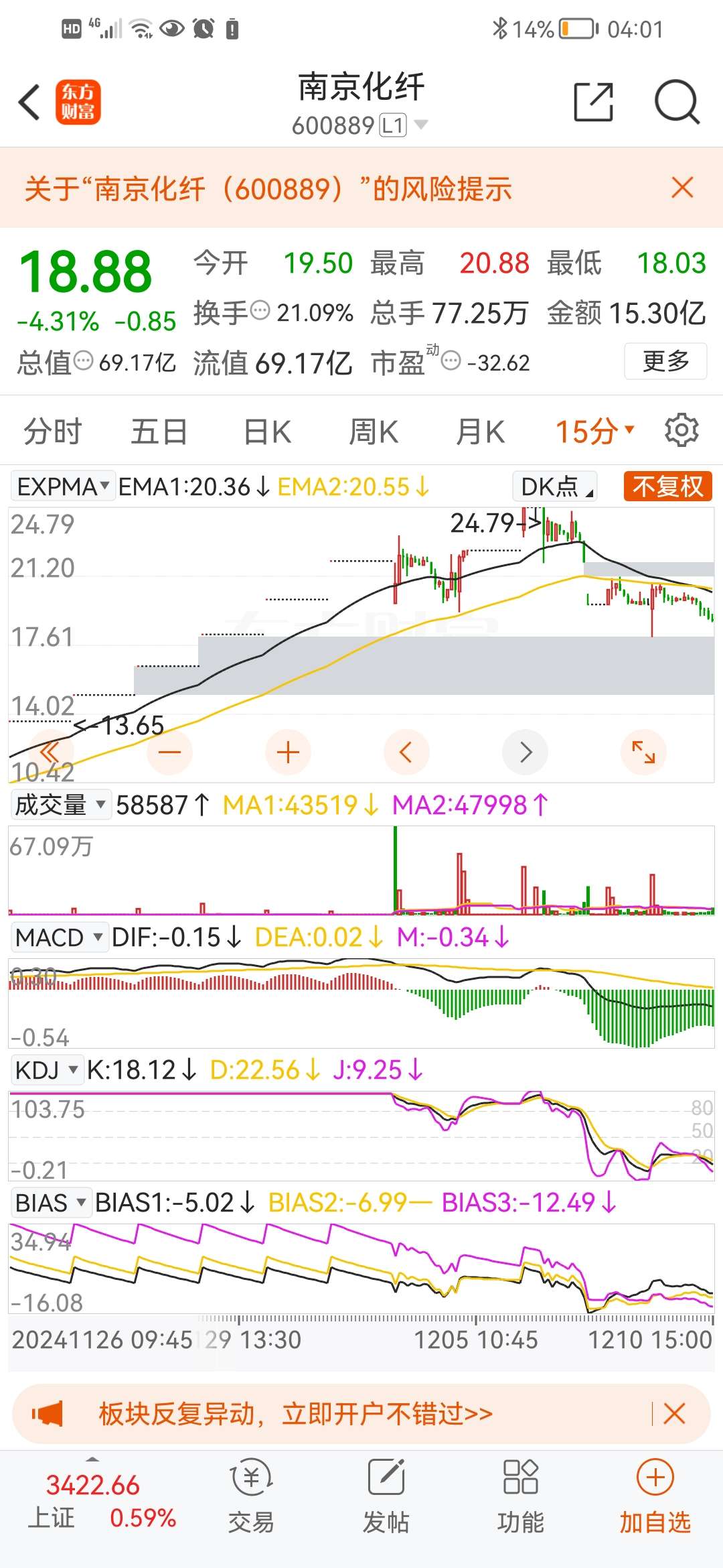 $南京化纤(SH600889)$ #复盘记录# 顶背离!