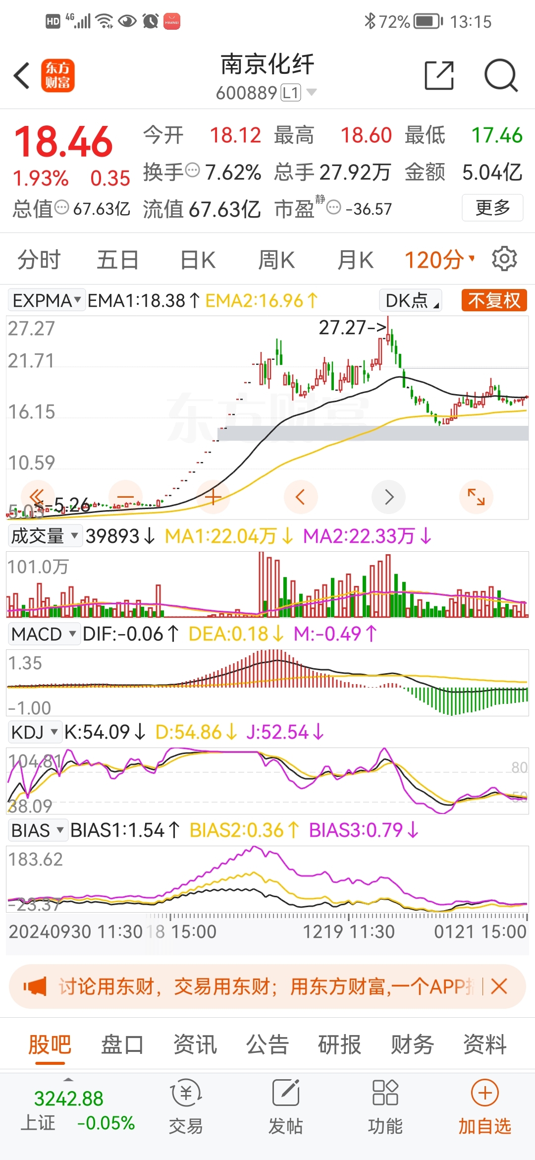 $南京化纤(SH600889)$ #炒股日记# 120分钟空头走势图!