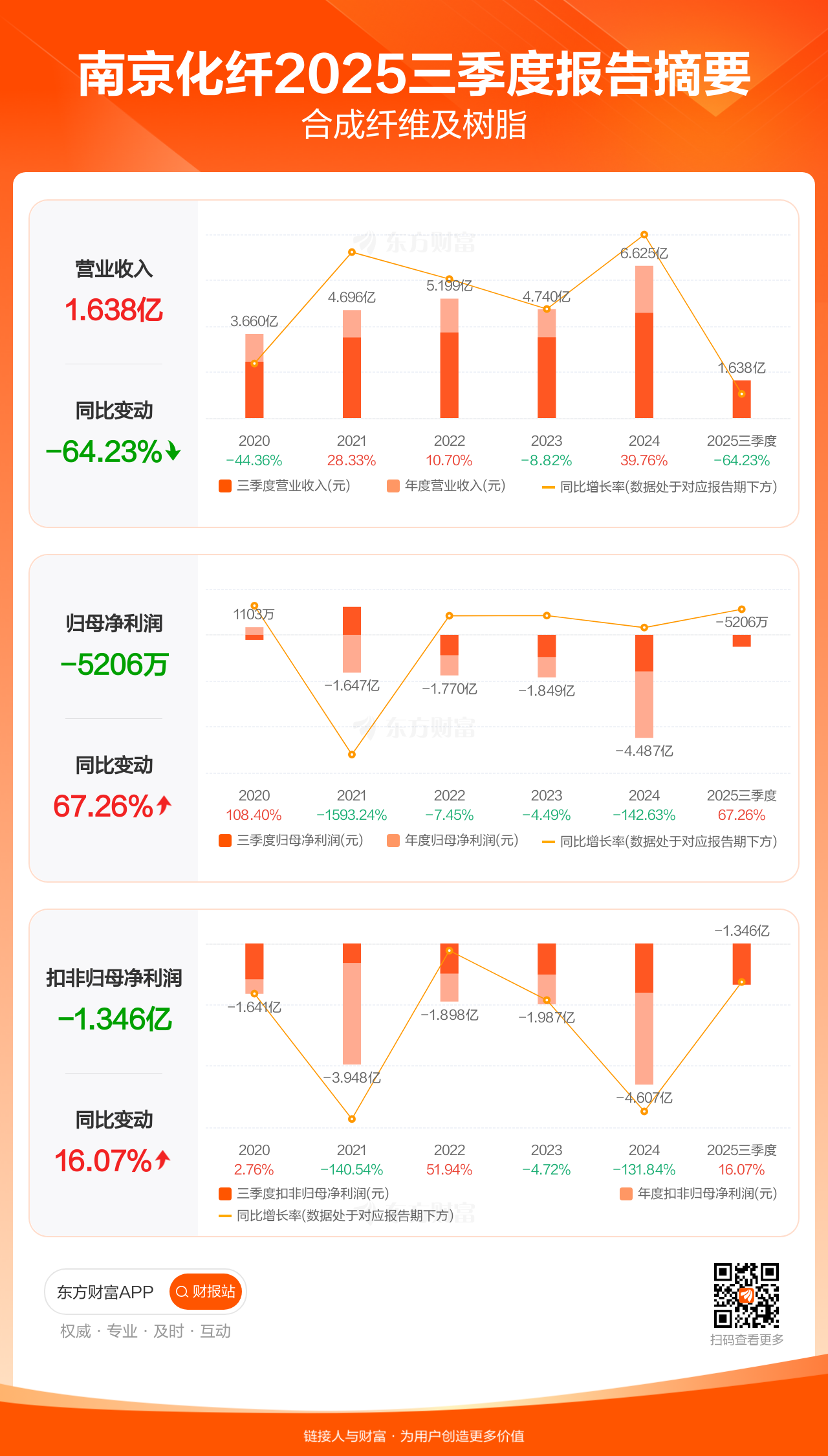南京化纤10月30日发布2025年三季报显示,公司前三季实现营业收入1.64亿元,同比下滑64.23%;归母净利润-5205.85万元;扣非归母净利润-1.35亿元