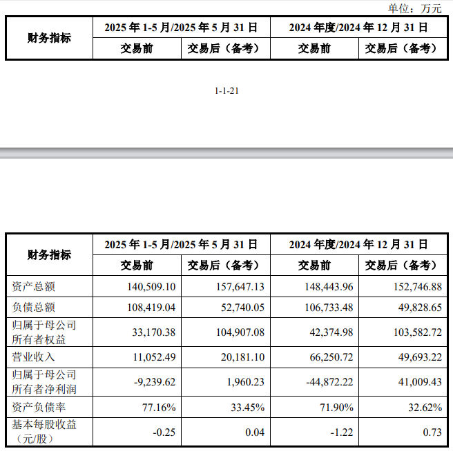 根据上述备考报表,交易完成后,2024年上市公司归母净利润将由亏损4.49亿元转为盈利4.10亿元;2025年1~5月净利润由亏损9,239.62万元转为盈利1,960.23万元;资产负债率由77.16%降至33.45%,基本每股收益由-0.25元提升至0.04元,实现扭亏为盈。