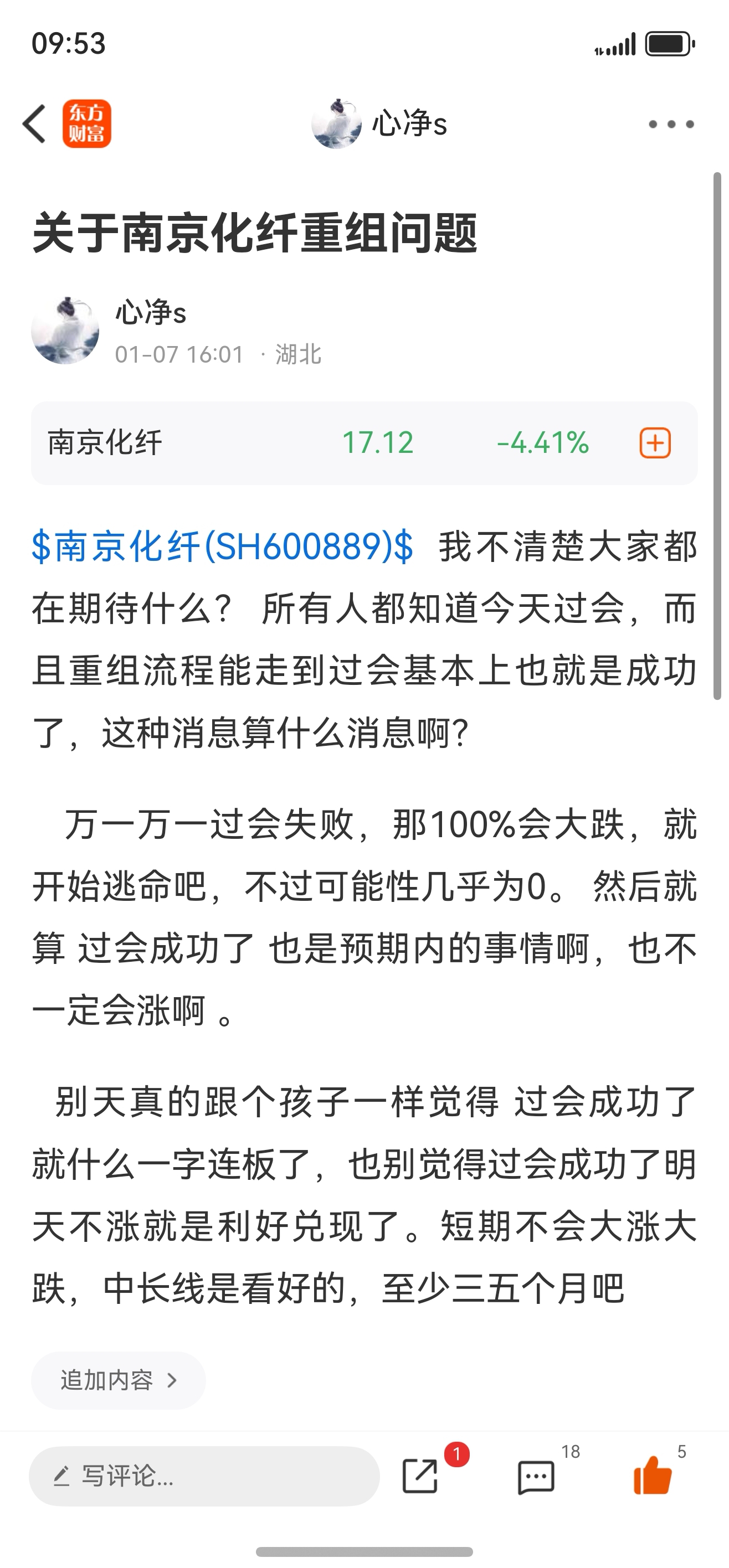 $南京化纤(SH600889)$ 昨天一堆小白 还在怼我。 说了无数遍 所有人都知道的利好 ,还能叫利好吗? 走到上交所过会这一步,理论上来说12月31号 就应该明白100%会过会成功的! 过会成功基本就确定已经重组成功了,接下来的两三个月 就只是走流程 证监会注册跟改名字了。后面注册改名成功也别在那里yy一字板了,都是明牌的东西, 长期三五年是看好的 ,短期有自己的走势