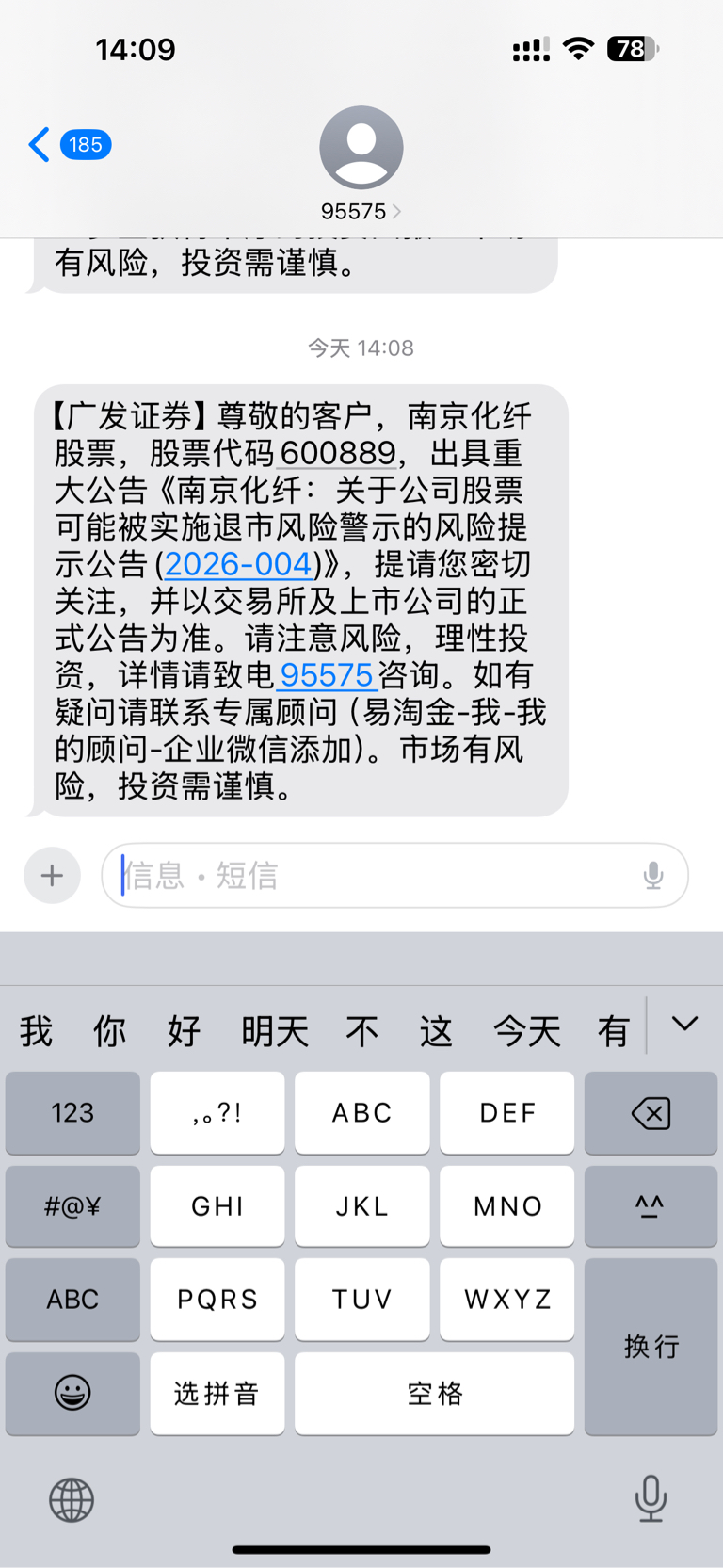 $南京化纤(SH600889)$ 卧槽!应该是乡亲们都收到短信了价格下来了。广大用户后知后觉……