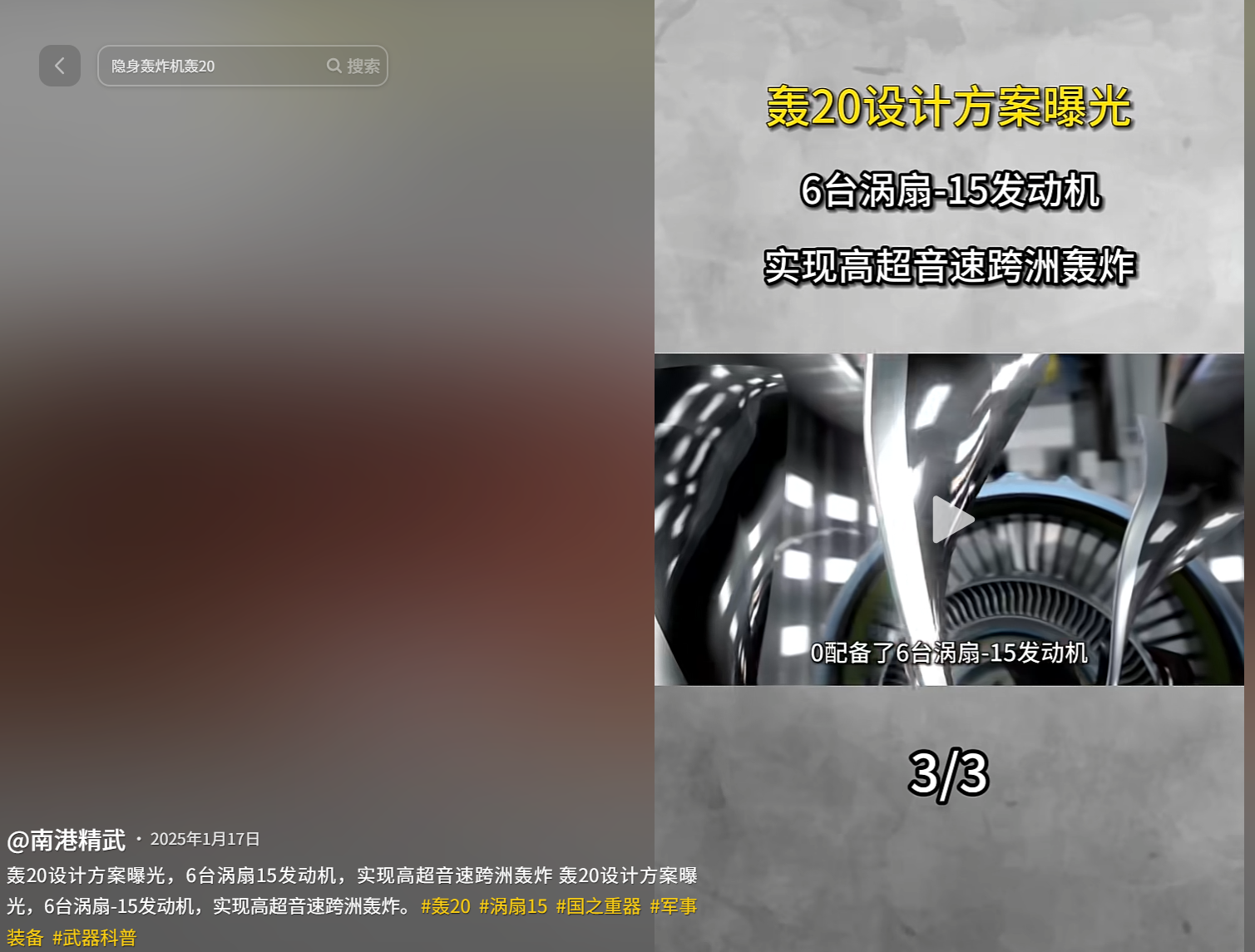 一架轰20装配6台航发发动机,占整机价值超30%。