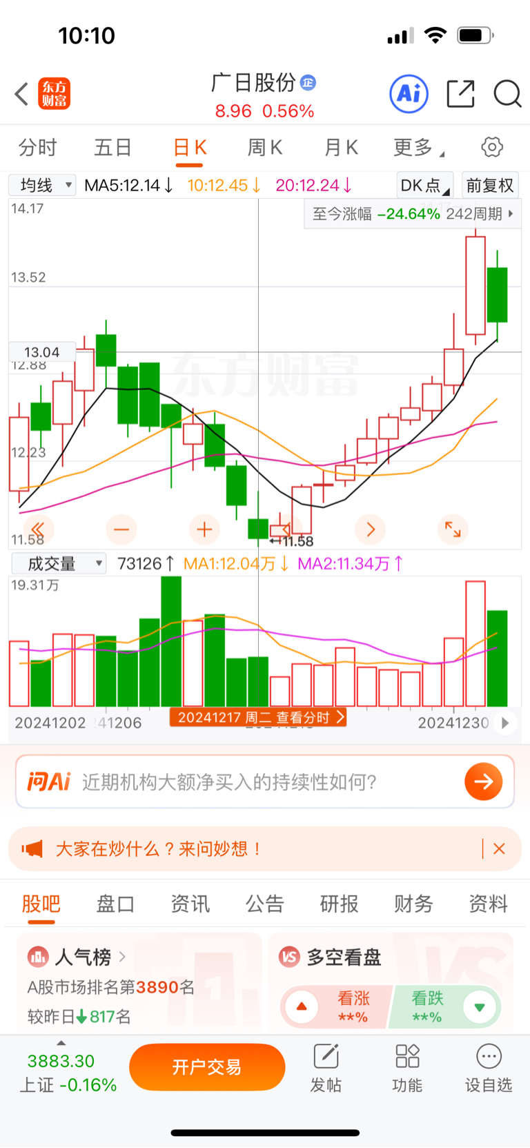 $广日股份(SH600894)$ 2024年12月15日至年底的K线。