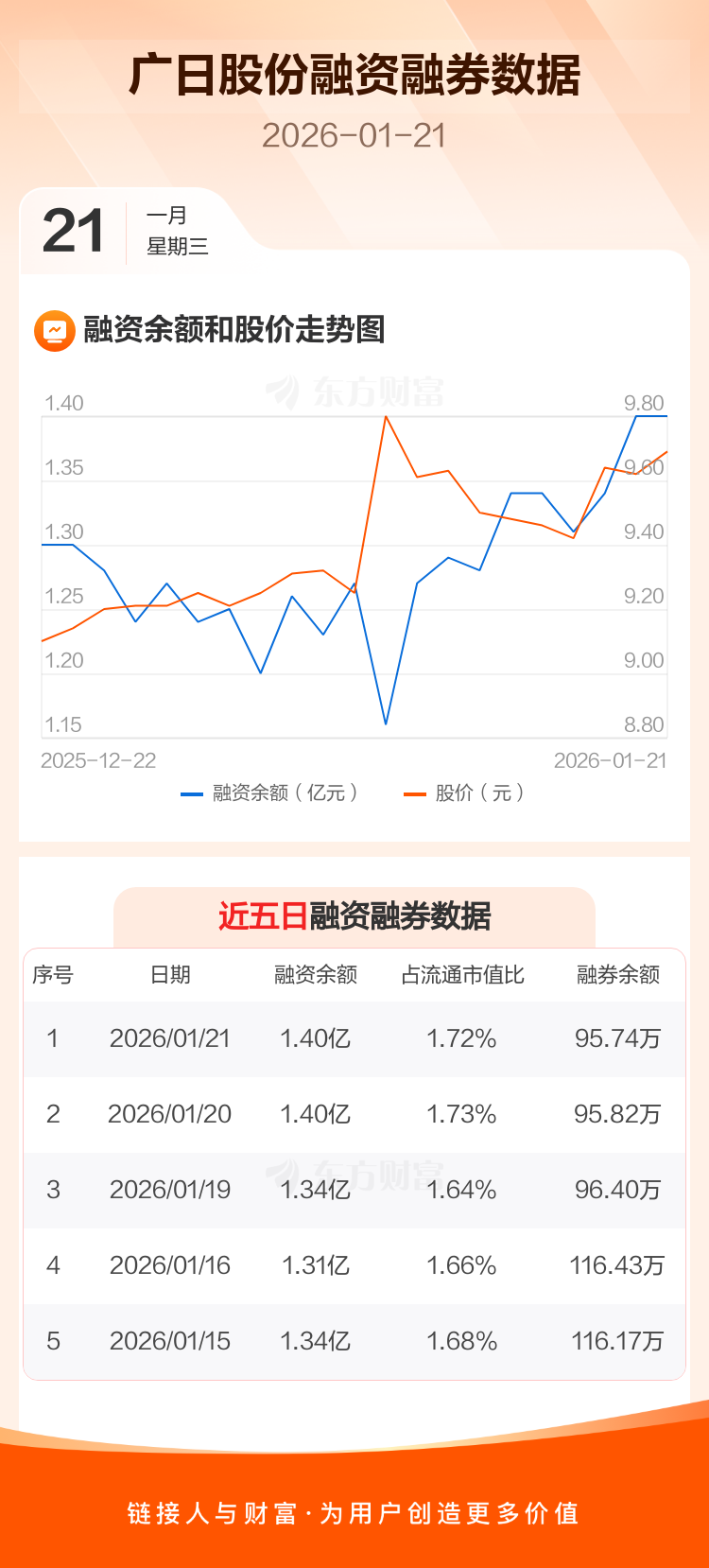 交易所最新数据显示,广日股份于2026年1月21日获融资买入447.99万元,融资偿还448.45万元,当日融资净偿还4638元。目前,该股融资余额1.40亿,占流通市值比例为1.72%。
