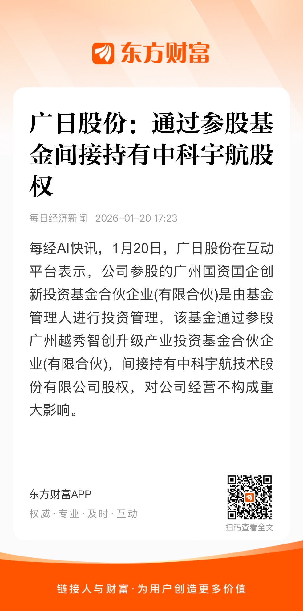 $广日股份(SH600894)$  每经AI快讯,1月20日,广日股份在互动平台表示,公司参股的广州国资国企创新投资基金合伙企业(有限合伙)是由基金管理人进行投资管理,该基金通过参股广州越秀智创升级产业投资基金合伙企业(有限合伙),间接持有中科宇航技术股份有限公司股权,对公司经营不构成重大影响。