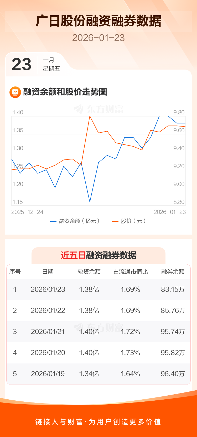 交易所最新数据显示,广日股份于2026年1月23日获融资买入561.47万元,融资偿还498.08万元,当日融资净买入63.39万元。目前,该股融资余额1.38亿,占流通市值比例为1.69%。